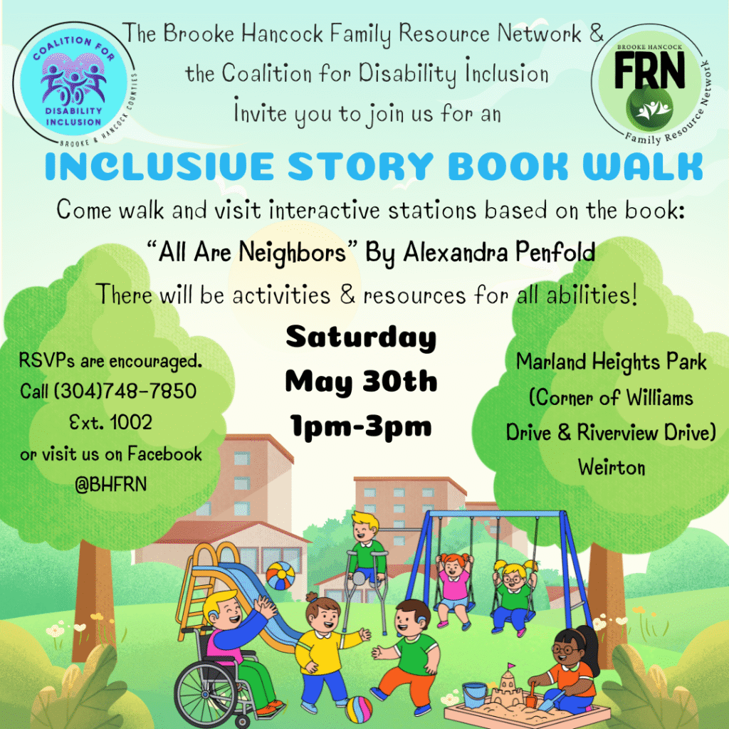 Come see Mary H. Weir Public Library at BHFRN’s Inclusive Story Book Walk at Marland Heights Park, along with a: Neighbor’s House, Weirton Transit, Bike Shop, Grocery Store, School, Playground/Park, Police Department, and Fire Department!The featured book is “All Are Neighbors” by Alexandra Penfold. We’ll see you on May 30, 2026 from 1-3 PM!
